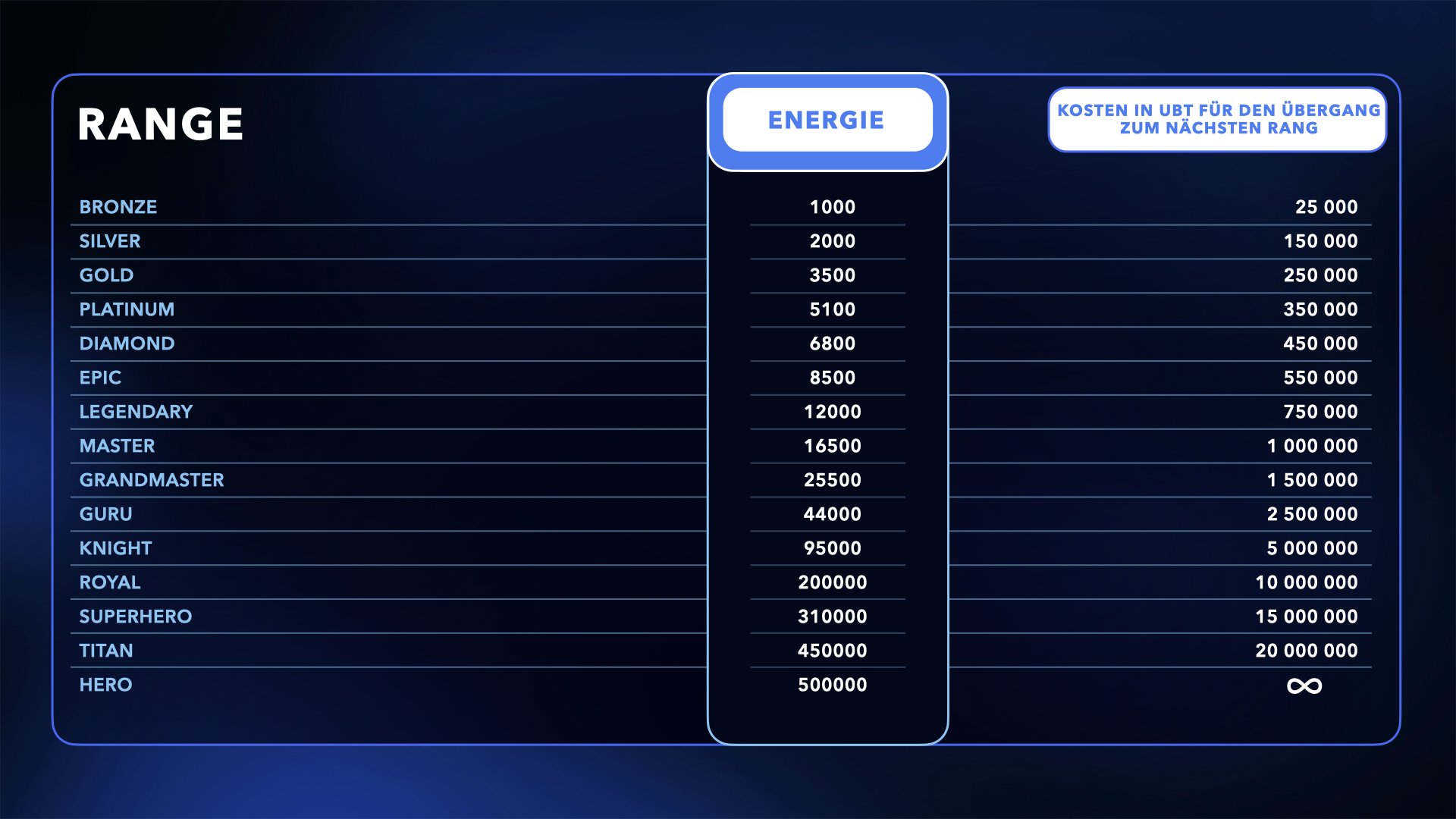 - Die Ränge erhöhen das tägliche Energielimit (z. B. von 1.000 bei Bronze auf 500.000 bei Hero).