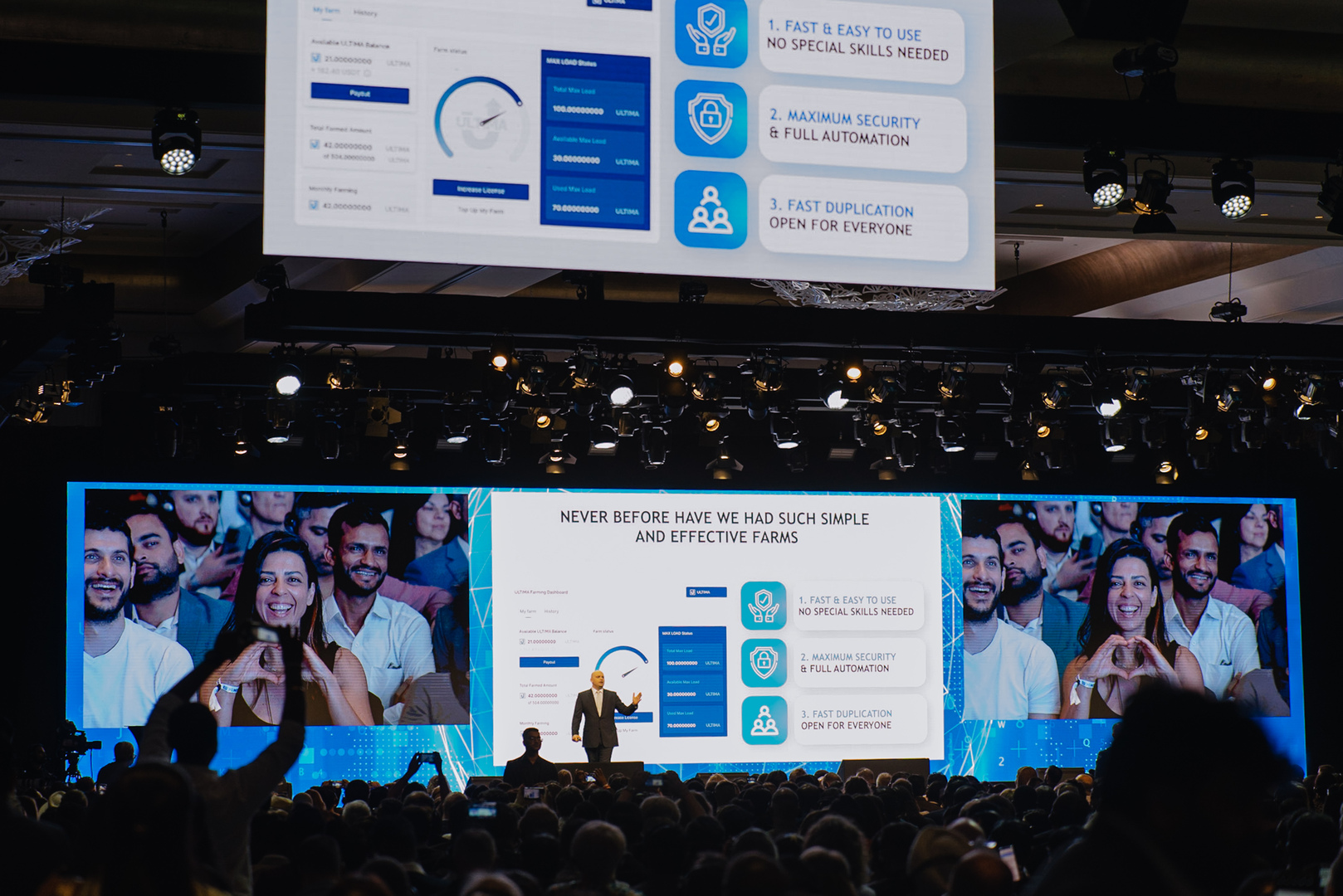 Momen yang paling dinantikan dari event ini tentu saja adalah pidato Alex Reinhardt, yang menghadirkan beragam pengumuman mengejutkan. Ia telah memperkenalkan jaringan baru Smart Blockchain beserta produk-produk yang akan bekerja di dalam jaringan ini, yakni koin dan tokennya. Selain itu, Alex juga memperkenalkan bursa kripto UltimEX, platform crowdfunding dan marketplace Ultima Store. Saat peluncuran Smart Blockchain, Alex juga memberikan kejutan kepada ribuan anggota komunitas yang hadir, dengan membuat transaksi pertama!